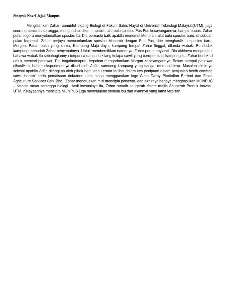 Sinopsis Novel Jejak Monpus. Mengisahkan zahar, penuntut bidang biologi di fakulti sains hayat di universiti teknologi malaysia(utm), juga Nama monpus ialah gabungan antara ulat bulu morgan dan pus pus yang telah dijejaki sekian lama. Terdapat synopsis bab yang saya kaji antaranya dilanda misteri. Novel yang saya kaji iaitu novel jejak monpus karya.